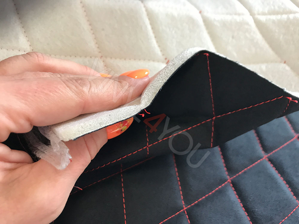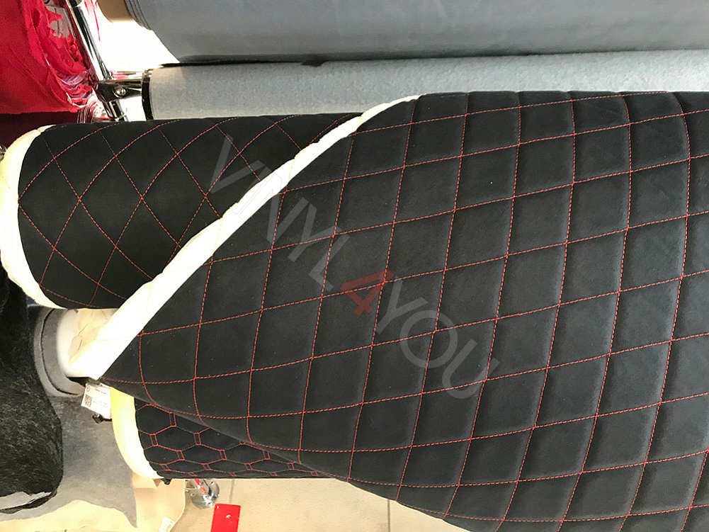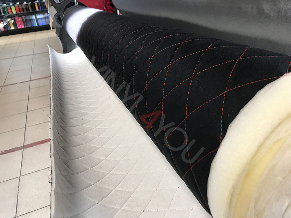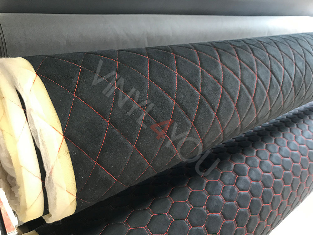 Алькантара стеганая черная Ромб с красной строчкой