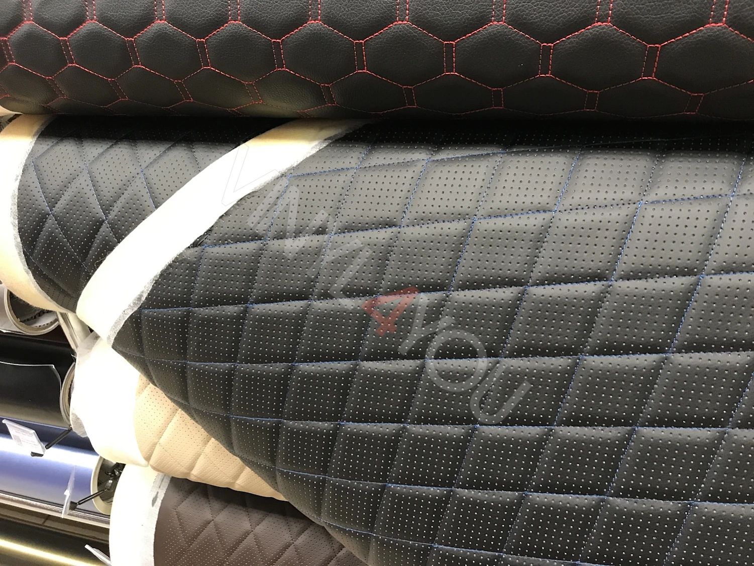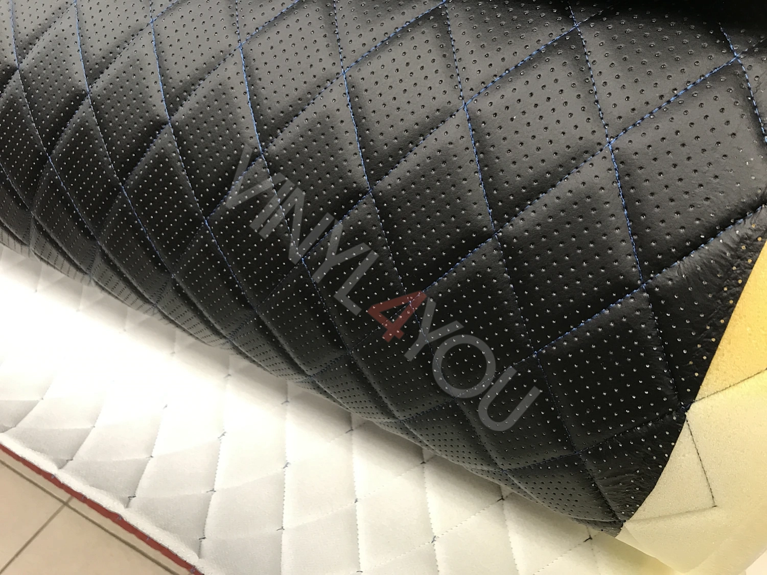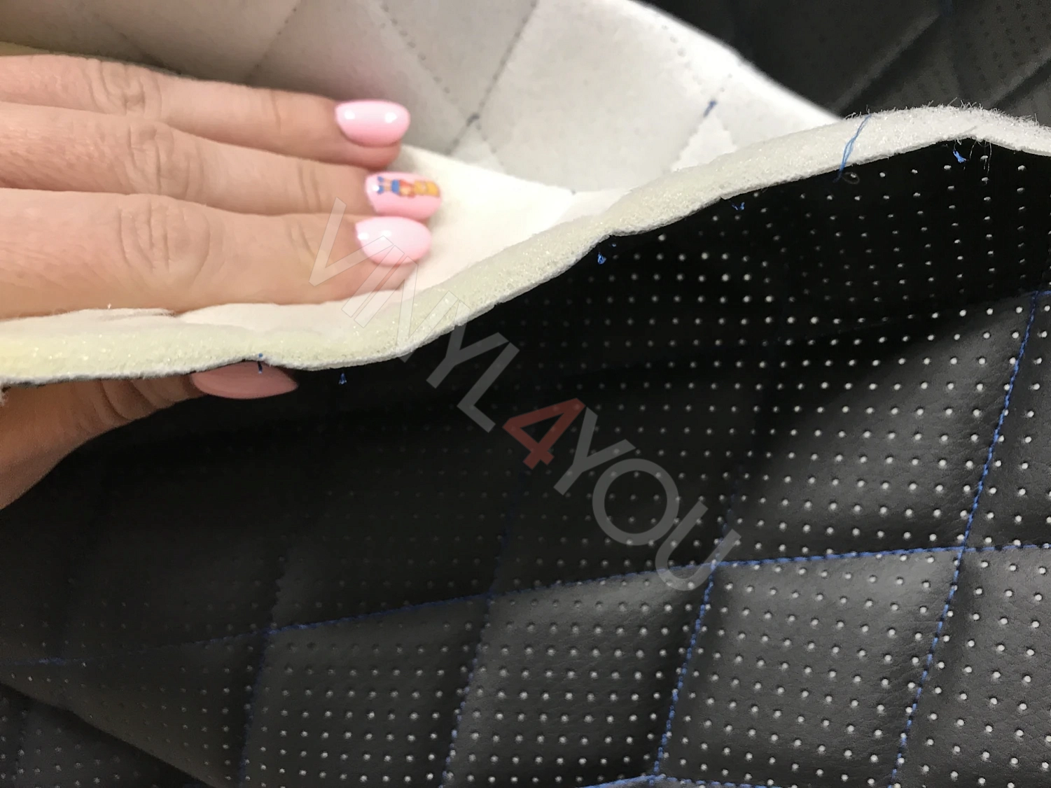 Экокожа стеганая перфорированная Ромб Черная с Синей строчкой